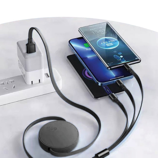3-in-1 Retractable USB Charging Cable (Type-C, Lightning & Micro USB) – Fast Charging 66W Matte Black Corporate Gift